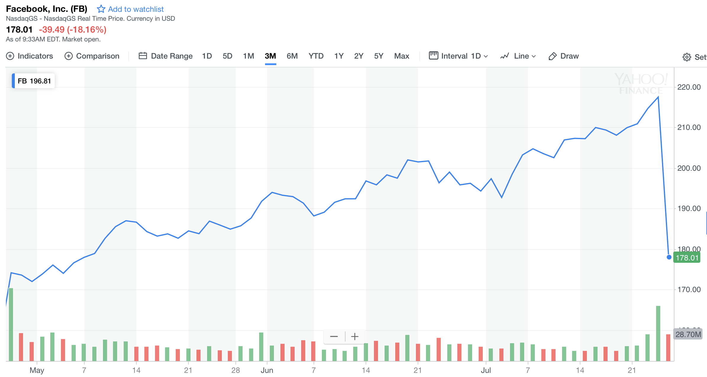 In what could be the biggest one-day drop of all time, Facebook shares opened at $174.89, down 19.6 percent compared to yesterday’s closing price of $217.50 (NASDAQ:FB).