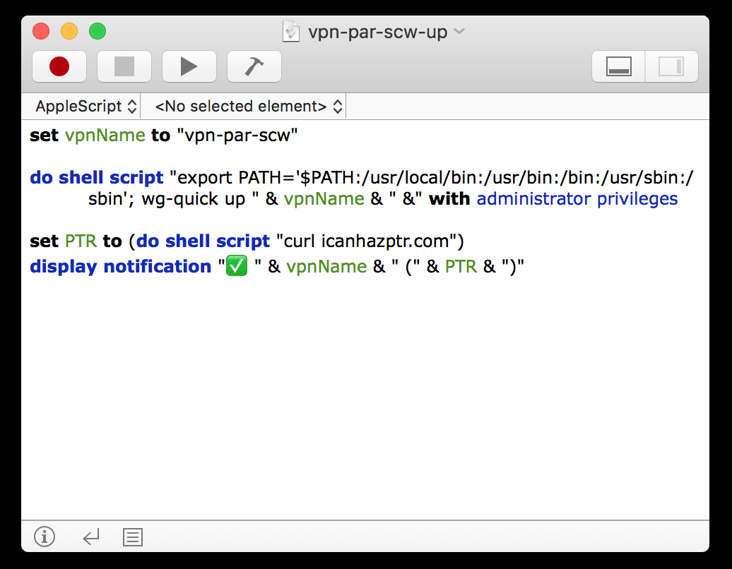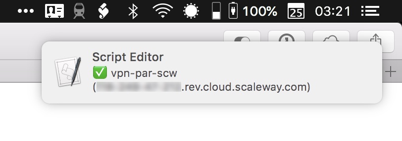 In my script, I also fetch my current hostname using icanhazptr.com. I then display my current hostname in a notification to check that I’m connected to the VPN server. In this case, I created a VPN server on Scaleway:
