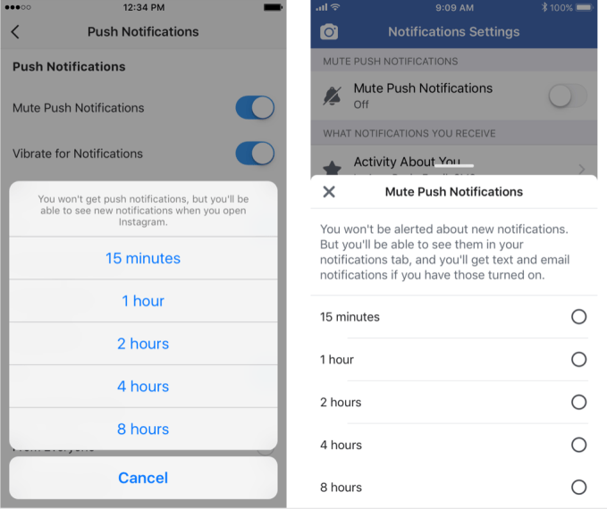 Beyond the daily and average minute counts, you can set a daily “limit” in minutes, after which either app will send you a reminder that you’ve crossed your self-imposed threshold. But they won’t stop you from browsing and liking, or force you to dig into the Settings menu to extend your limit. You’ll need the willpower to cut yourself off. The tools also let you mute push notifications (you’ll still see in-app alerts), but only for as much as 8 hours. If you want anything more permanent, you’ll have to dig into their separate push notification options menu or your phone’s settings.