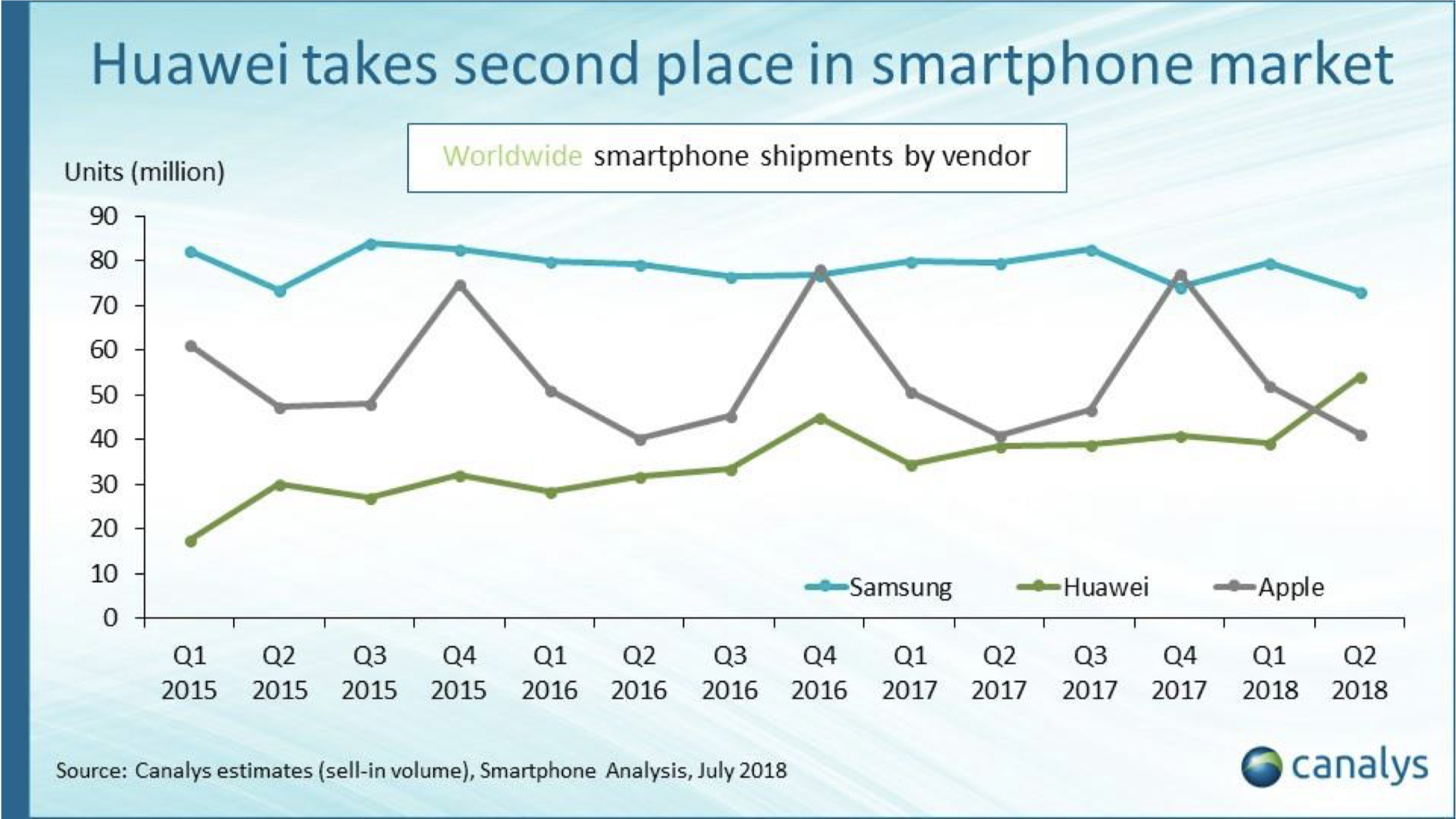 Samsung is shipping 10.4 percent less smartphones but still remains the leader with 20.9 percent market share, or 71.5 million smartphones. In other words, many Samsung buyers are now buying Huawei devices, or other Android devices.