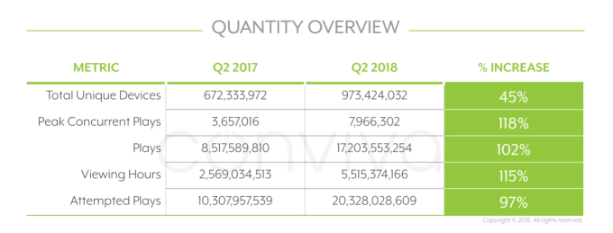 In addition, the World Cup had a remarkable impact on metrics like viewing hours, plays, and peak concurrent plays, the firm found. 7.9 million people tuned in for the World Cup online, which led to a 118 percent growth in peak concurrent plays over Q2 2017.