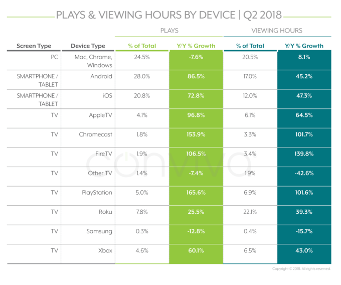 Other platforms – including Sony’s PlayStation, Google’s Chromecast, and Amazon’s Fire TV – all gained as well, and combined saw more than two times video consumption, versus the year-ago period. Some of their growth is coming from the decline of native TV platforms, like Samsung’s smart TV, as consumers shifted to Roku, Chromecast, and Fire TV.