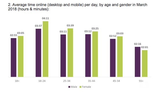 Perhaps contrary to some people’s expectations, women in the UK spend more time online on average than men across almost all age groups, with the sole exception being the over 55s (where the time difference is pretty marginal)…