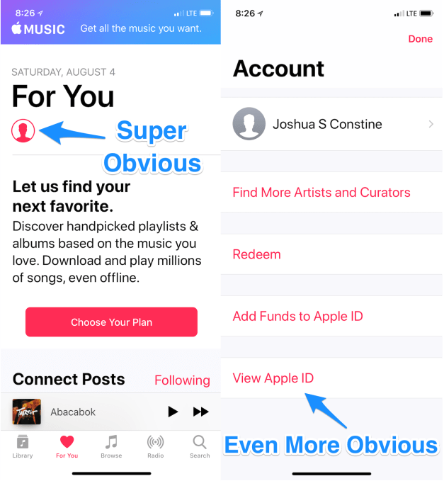 Want to cancel your Apple Music subscription or some other service you got roped into with a free trial? It’s SUPER easy. First, click the totally unlabeled and generic circle with a blotch in it that’s supposed to be a profile picture icon. You should see a “Manage Subscriptions” option…but you don’t. Instead, you’ll have to know to tap “View Apple ID”. Once you auth in with the same face or thumbprint that opened your phone in the first place you’ll find the option to cut them off. And as thank you for this convenience, you’ll get to pay 30 percent extra on some subscriptions if you pay through Apple. It’s clearly exploitative dark pattern design.