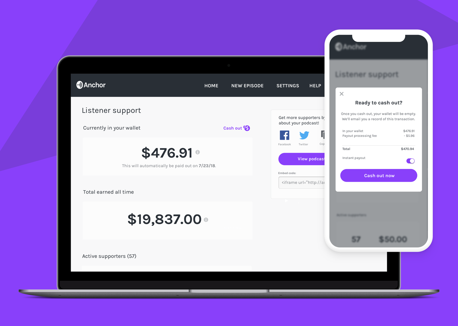 Once enabled on an Anchor dashboard, hosts are encouraged to share a link in their show notes, where listeners can plunk down $0.99, $4.99 or $9.99 a month for the privilege of audio content. After the money starts flowing in, hosts can collect their earnings by hitting the Cash out now button.