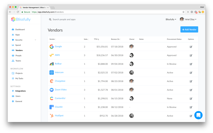 Company co-founder and CEO Ariel Diaz says Blissfully actually helped him and his co-founder solve a problem they were having tracking the SaaS usage at their previous startups. Like many companies, they were using spreadsheets to track this information and they found it was untenable as the company grew beyond 30 or 40 people. They figured there had to be a better way, so they built one.