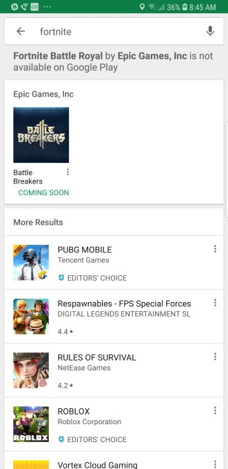 Google lists PUBG Mobile, Fortnite’s biggest competitor, at the top of all Fortnite Battle Royale queries, but doesn’t include anything in its message around how to actually find the real Fortnite Battle Royale for Android.