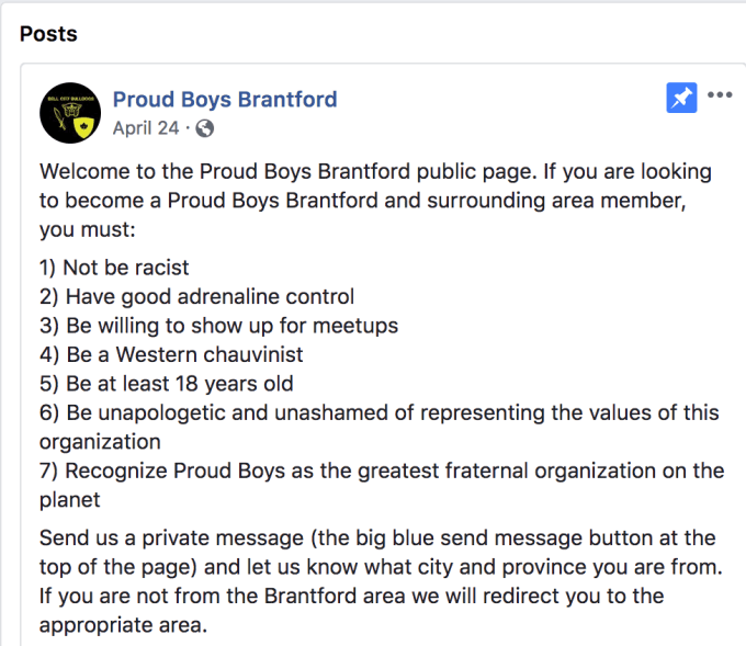 Like much of the young, internet-fluent alt-right, the Proud Boys intentionally don’t take themselves too seriously, a strategy that conveniently opens the door for them to denounce any kind of controversy that might arise. They show up to protests wearing black and gold Fred Perry polo shirts, have a whole charter’s worth of inside jokes and in general seem a bit more media and internet savvy than hardline white nationalist groups, some of which Facebook has managed to clear out in the last year.