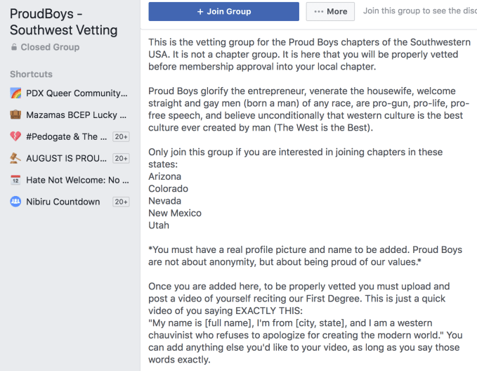 That’s where the Proud Boys Facebook network comes in. To get accepted into a local chapter, prospective members join specific vetting groups and are asked to upload a video of them meeting their “first degree” requirements: