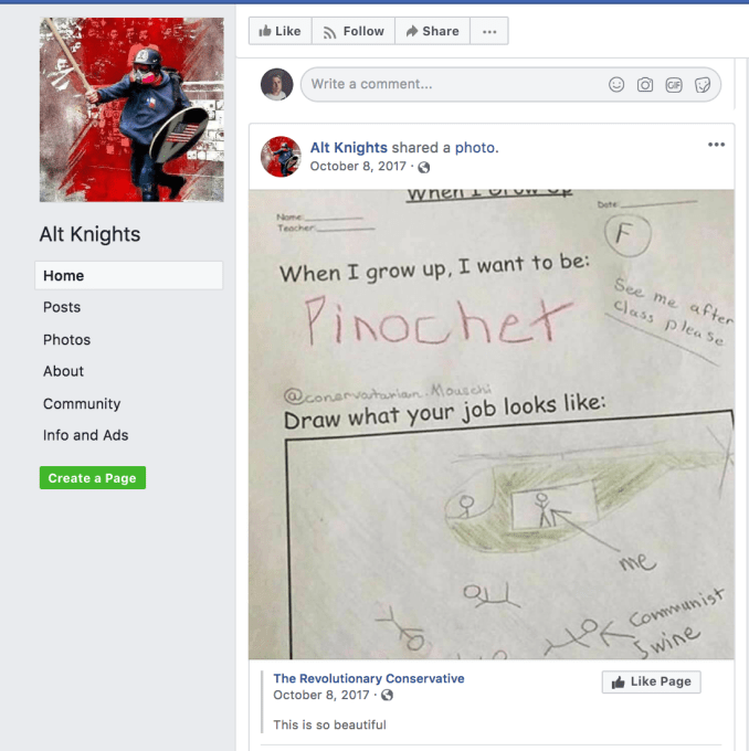 Facebook also hosts pages dedicated to the Fraternal Order of the Alt-Knights, a new-ish subdivision of the Proud Boys and its paramilitary wing. The Alt-Knights, also known as FOAK, are led by Kyle Chapman, a.k.a. “Based Stickman,” a far right figure who grew to fame after beating political enemies with a stick at a 2017 Berkeley protest. The Alt-Knights aren’t always quite as careful to denounce violence.