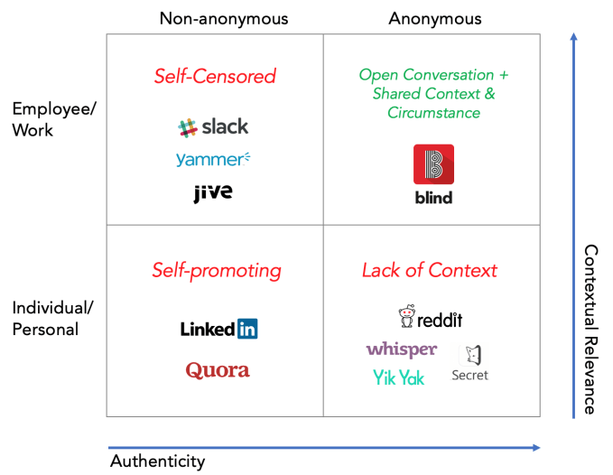 Self-Censored (Non-Anonymous + Employee/Work) – On the enterprise side, Yammer, Jive, and recently Slack have attempted to upgrade the creaky company intranet into the enterprise social network. While these tools might make it easier to connect to your coworkers, the conversations happening on these platforms are no different than before – ultimately, these tools are designed to get work done, not for questioning, debating, or reflecting on how work should be. Conversations about sensitive subjects (e.g. how to deal with a bad manager) are unlikely to happen on a non-anonymous, corporate-sanctioned platform where that same bad manager might well be watching.