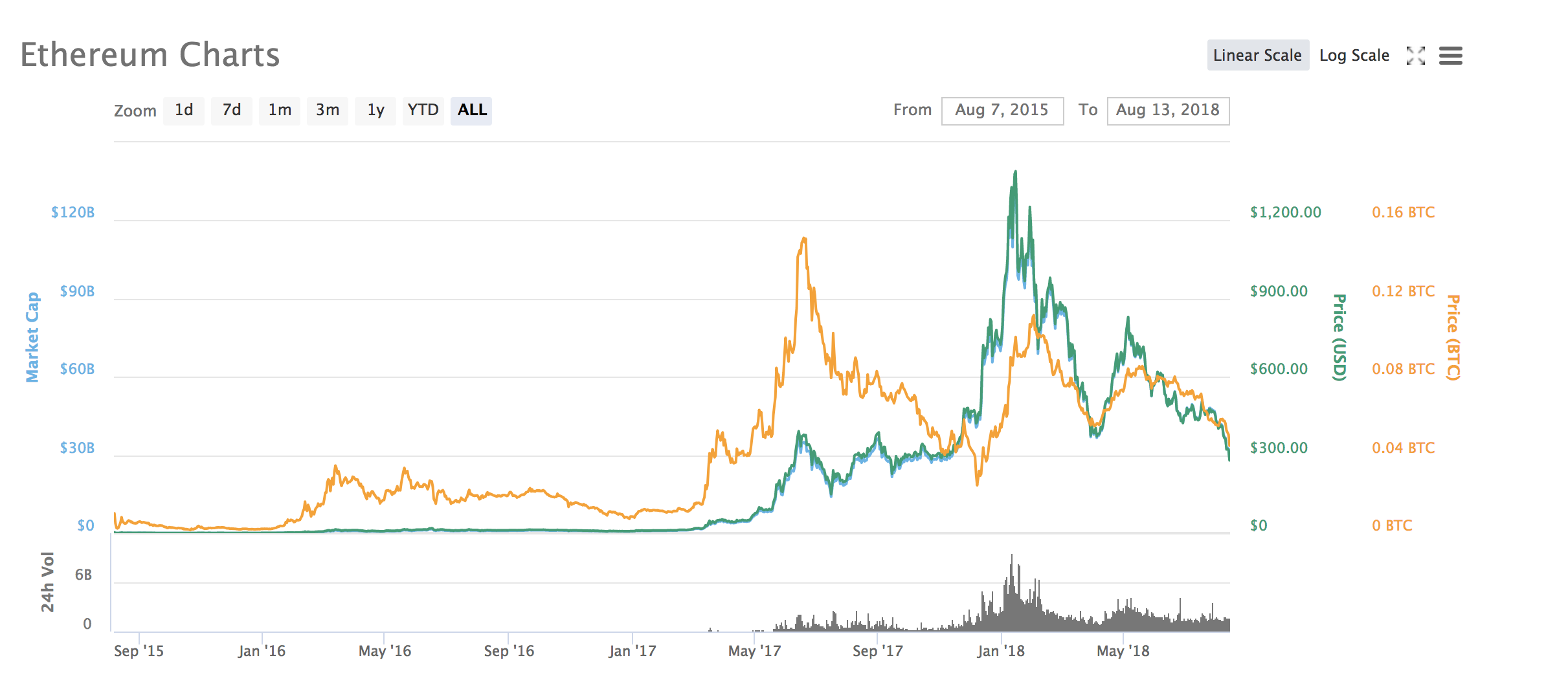 The drop also marks the first time ever that the price of an Ether has fallen below its valuation over one year: one Ether is worth $266 right now at the time of writing, versus $304 on August 14 2017. The token has been steadily falling since early May, when its peak value was $808, and as the lynchpin for many ICO project tokens, its demise has sent the value of most other tokens down, too.