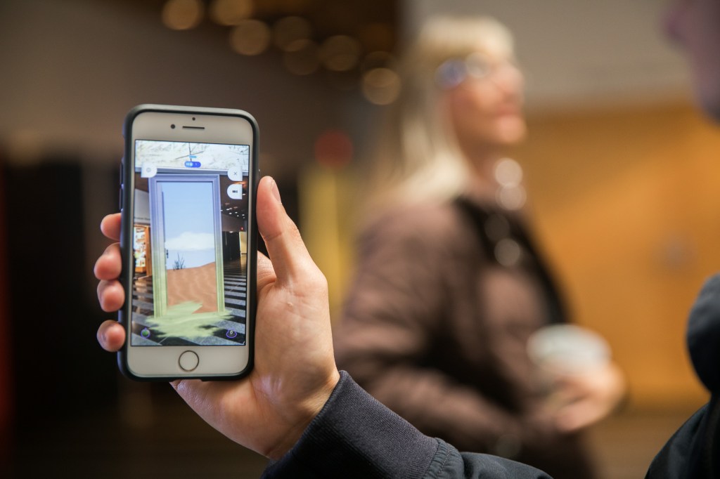 The one-night public beta experience at San Francisco Museum of Modern Art was previewed earlier this month with an activation in the atrium and upstairs lobby before entering the Magritte exhibit. The experience takes some familiar themes from the artist and allows phone-wielding visitors to step through AR portals that drew on iconic elements from Magritte’s work and the surrealism aspect. It’s an intriguing concept that seems particularly well-suited for the surrealist artist.