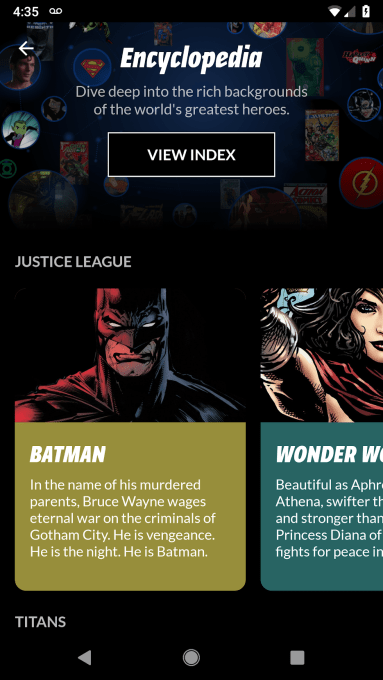 There’s an Encyclopedia that lets you read the heroes’ backgrounds, another screen shows, plus digital comics to download, and a simple rating system involving a thumbs up icon.