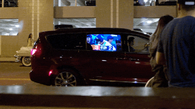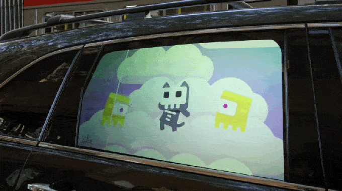 Grabb-It applies a material to the inside of a car’s right rear window to act as a projection surface. The material is thin enough that the window can still be opened — but, in what might annoy some passengers, not thin enough that you can see much through it. They mount a small projector inside the car and point it toward the window, blasting an image bright enough to see from the outside. I saw it running in a dim below-ground parking lot and outside in direct sunlight, and the image was surprisingly clear in both cases.