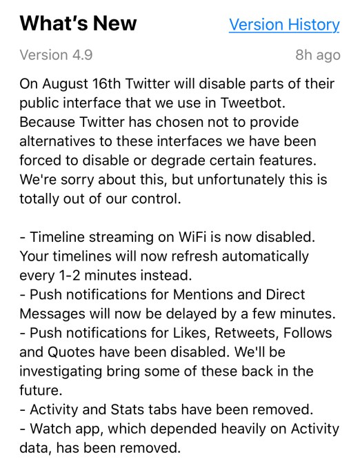 Twitter’s API changes won’t come out until tomorrow, but its ramifications are already being felt. Tapbots released an update today to Tweetbot for iOS that loses many of the Twitter client’s most popular or essential features. It also removed its Apple Watch app. In Tweetbot’s App Store release notes, Tapbots explained “on August 16th Twitter will disable parts of their public interface that we use in Tweetbot. Because Twitter has chosen not to provide alternatives to these interfaces we have been forced to disable or degrade certain features. We are sorry about this, but unfortunately this is totally out of our control.”
