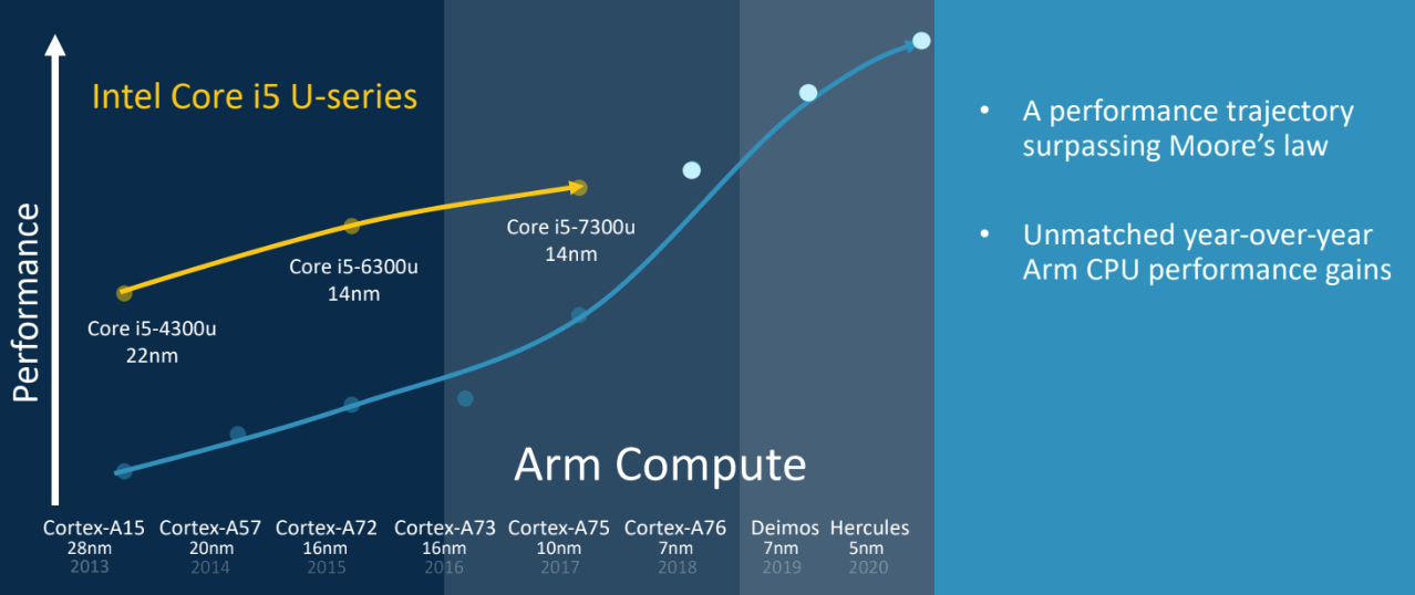 Indeed, Ian Smythe, Arm’s senior director of its marketing programs, doesn’t shy away from comparing the next generations of its architectures with Intel’s mid-tier Core i5 processors.