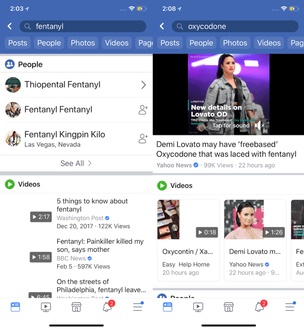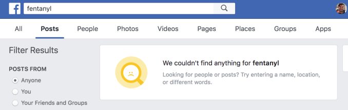 Hours after the new stats were reported by The New York Times and others, a source spotted that Facebook’s internal search engine stopped returning posts, Pages and Groups for searches of “OxyContin,” “Xanax,” “Fentanyl” and other painkillers, as well as other drugs like “LSD.” Only videos, often news reports deploring opiate abuse, and user profiles whose names match the searches, are now returned. This makes it significantly harder for potential buyers or addicts to connect with dealers through Facebook.