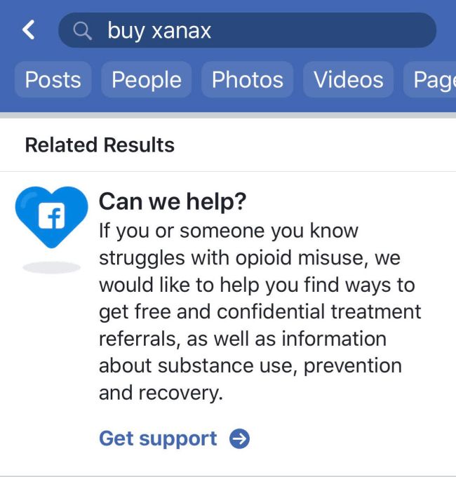 On some search result pages for queries like “buy xanax,” Facebook is now showing a “Can we help?” box that says “If you or someone you know struggles with opioid misuse, we would like to help you find ways to get free and confidential treatment referrals, as well as information about substance use, prevention and recovery.” A “Get support” button opens the site of The Substance Abuse and Mental Health Services Administration, a branch of the U.S. department of health and human services that provides addiction resources. Facebook had promised back in June that this feature was coming.