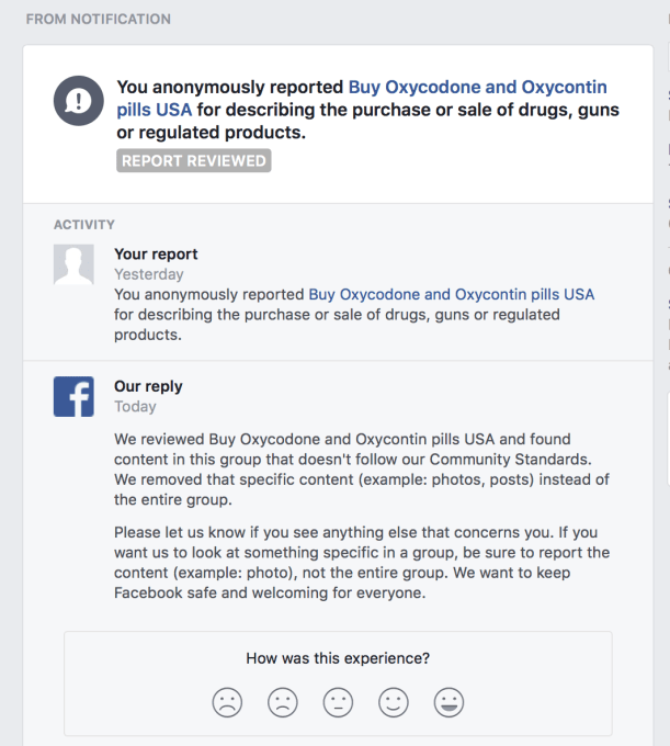 The new actions follow Facebook shutting down some hashtags like “#Fentanyl” on Instagram back in April that could let buyers connect with dealers. That only came after activists like Glassbreakers’ Eileen Carey aggressively criticized the company, demanding change. In some cases, when users would report Facebook Groups’ or Pages’ posts as violating its policy prohibiting the sale of regulated goods like drugs, the posts would be removed, but Facebook would leave up the Pages. This mirrors some of the problems it’s had with Infowars around determining the threshold of posts inciting violence or harassing other users necessary to trigger a Page or profile suspension or deletion.