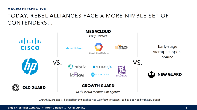 The report points out the broader landscape in which enterprise companies — startups and established players alike — are operating today. You have traditional tech companies like Cisco and HP, the mega cloud companies like Amazon, Microsoft and Google, the Growth Guard with companies like Snowflake, DataDog and Sumo Logic and the New Guard, those early stage enterprise companies gunning for the more established players.