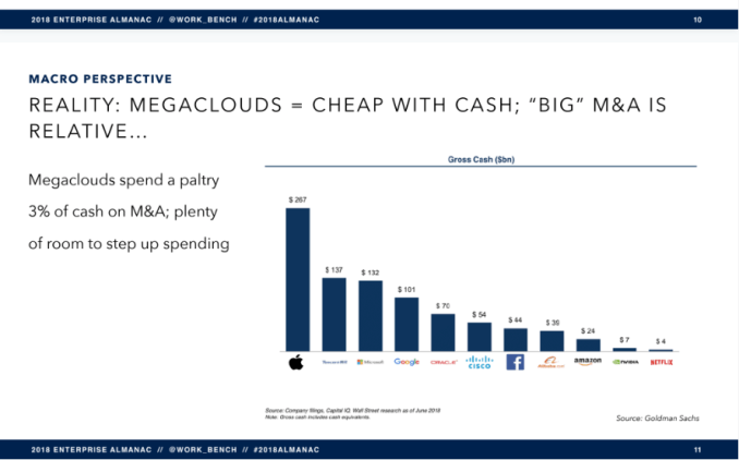 The mega clouders also scoop up a fair number of startups. Yet they don’t devote quite the level of revenue to M&A as you might think based on how acquisitive the likes of Salesforce, Microsoft and Oracle have tended to be over the years. In fact, in spite of all the action and multi-billion deals we’ve seen, Work-Bench sees room for even more.