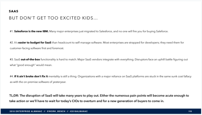 But today, Work-Bench is saying that we are seeing some other trends that could be tipping the scales back to infrastructure. That includes containers and microservices, serverless, Database as a Service and React for building front ends. Work-Bench argues that if every company is truly a software company, these tools could make it easier for companies to build these kind of services cheaply and easily, and possibly bypass the SaaS vendors.