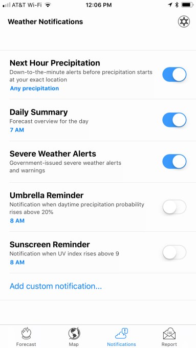 The updated app offers an improved set of notifications, allowing you to toggle on or off things like Next Hour Precipitation, Daily Summary, Severe Weather Alerts, Umbrella Reminder, Sunscreen Reminder or your own custom notifications, based on other conditions that matter to you – like UV index forecasts, for instance.