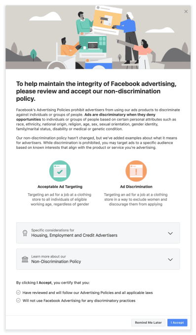 It also said that it would roll out a new certification to U.S. advertisers through its Ads Manager tool, that will require the advertisers to properly register their compliance with Facebook’s non-discrimination policy if they post housing, employment or credit ads. The advertisers will need to complete the certification, which involves being educated on the policy and agreeing to it through a form.