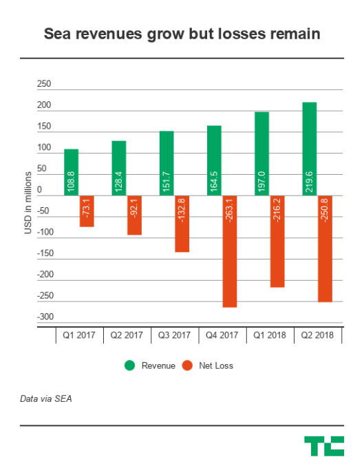 The Tencent-backed company went public back in October when it raised around $1 billion through an NYSE listing. Its latest earnings released today show revenue broke $200 million for the first time ($219.6 million) but losses continue to pile up. Revenue was up 71 percent year-on-year to hit the record figure but Sea’s losses continue to stack up. The company lost $250.8 million in Q2, up significantly from a $92.1 million loss one year previous and $216.2 million negative in the previous quarter.