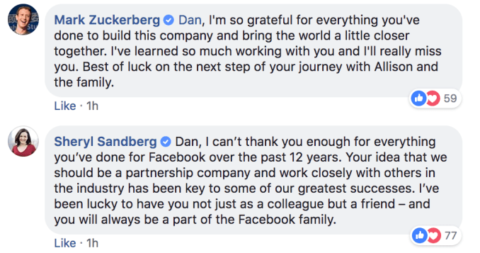 “Your idea that we should be a partnership company and work closely with others in the industry has been key to some of our greatest successes,” Sandberg said. “I’ve been lucky to have you not just as a colleague but a friend – and you will always be a part of the Facebook family.”
