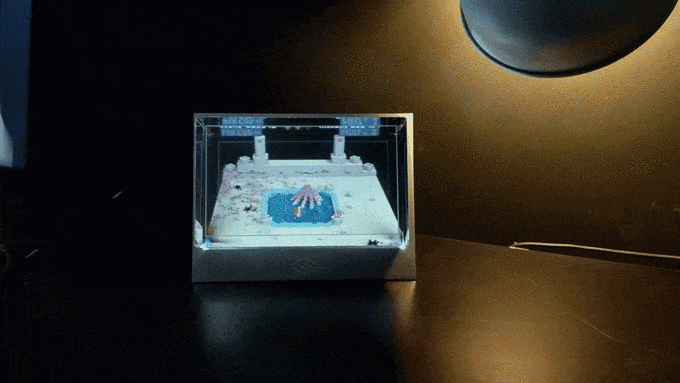 The display is beaming 45 views of an object, each at 60 frames per second delivering images that you can peer around and see multiple angles of. How it works is that the display is basically sending out a fan of perspectives which can be observed by multiple people from multiple perspectives. No matter what you initially hear about the technical details of how it all works, there is a certain degree of disbelief baked into seeing a volumetric display like this for the first time. It’s like… looking into a fishbowl of pixels.