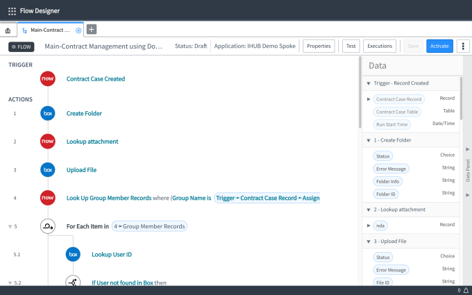 On a practical level, customers can grab the Box plug-in from the ServiceNow Store. It comes with some prebuilt workflows for typical ServiceNow product usage scenarios, but the integration is flexible and allows customization. As an example, in an HR scenario, the ServiceNow administrator might build a workflow for onboarding a new employee in ServiceNow’s HR application. Using the company’s Flow Designer workflow-building tool, they can pull in all the documents a new employee needs to sign with other tasks into a single workflow.