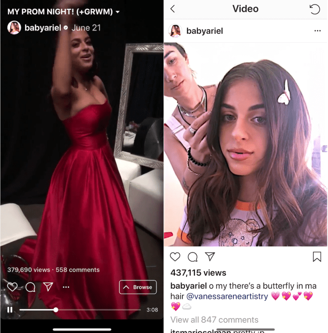 Only one of the six, BabyAriel, saw an obvious growth trend in her IGTV videos. Her candid IGTV monologues are performing the best of the six compared to feed. She’s earning an average of 243,000 views per IGTV video, about a third as many as she gets on her feed videos. “I’m really happy with my view counts because IGTV is just starting” BabyAriel tells me. She thinks the format will be good for behind-the-scenes clips that complement her longer YouTube videos and shorter Stories. “When I record anything, It’s vertical. When I turn my phone horizontal I think of an hour-long movie.”