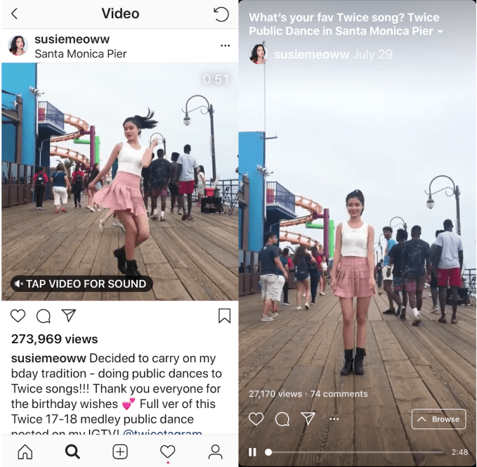 Fitness guides from Katie Austin averaged just 3,600 views on IGTV while she gets 7.5X more in the feed. Lauren Godwin’s colorful comedy fared 5.2X better in the feed. Bryce Xavier saw the biggest differential, earning 15.9X more views for his dance and culture videos. And in the most direct comparison, K-Pop dancer Susie Shu sometimes posts cuts from the same performance to the two destinations, like one that got 273,000 views in feed but just 27,000 on IGTV, with similar clips fairing an average of 7.8X better.