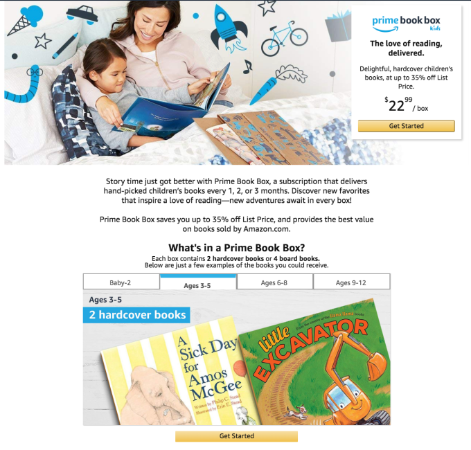 Amazon today publicly launched a new perk for Prime members with young children, with the broad release of the new subscription-based “Prime Book Box” service. The $22.99 per box offering ships Prime members in the U.S. a curated selection of kids’ books every 1, 2 or 3 months, at up to 35% off the list price, Amazon says. The service was first launched in May, but was only available in an invite-only basis at that time.
