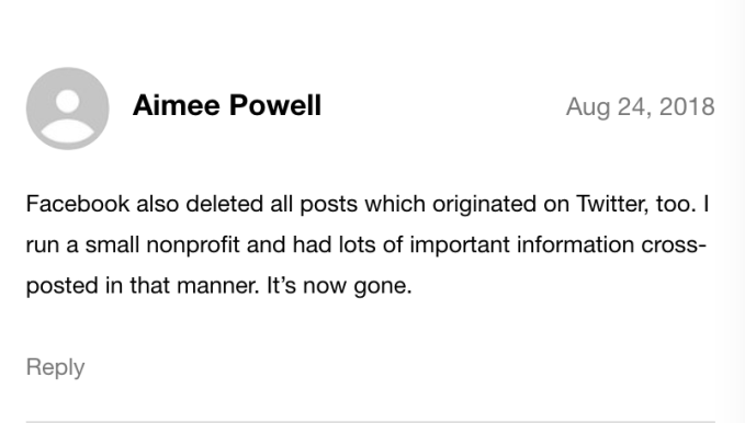 TechCrunch editor Matthew Panzarino is one of those here who was impacted. He points out that the ability to share tweets to Facebook was a useful way to reach people who weren’t on Twitter in order to continue a discussion with a different audience.