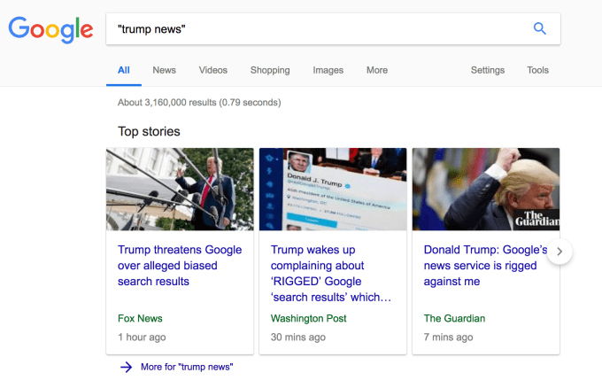 While several tech giants have found themselves in President Trump’s crosshairs since he took office, he has just unleashed what looks to be his most sustained attack on Google to date — firing off a couple of tweets at ~5.30am Washington DC time to rail against what he claims is algorithmic bias in the results the search engine serves up if someone types in “Trump News”.