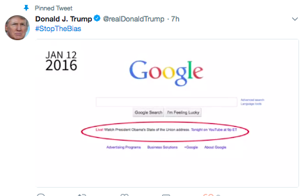 Google is pushing back against a claim by Donald Trump that the search engine stopped promoting State of the Union livestreams on its homepage after his presidency began. Trump’s claim came in the form of a tweeted video, which was still pinned to the top of his profile when this post was published at 9:30 PM PST, Aug. 29, 2018, after Google’s refutation and multiple media reports of its inaccuracy.