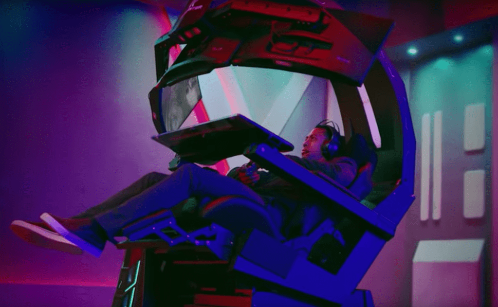 The whole thing suggests some old school smokey VR arcade. It’s really a kind of self-contained, motorized cockpit with a seat that reclines 140 degrees, to peep up to three 27-inch monitors. It’s stupid and extravagant and kind of cool and probably half the size of my New York City apartment.