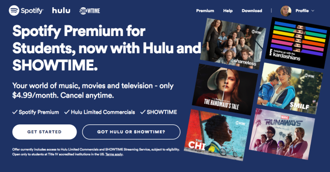 Spotify today is announcing a new way for students to access its Premium service, along with Hulu and Showtime, for a discounted price of $4.99 per month for all three. The new deal is an expansion of the existing Hulu and Spotify bundle for students, which launched around a year ago at the same price. Now those existing subscribers as well as new ones will be able to stream from all three services when they sign up.