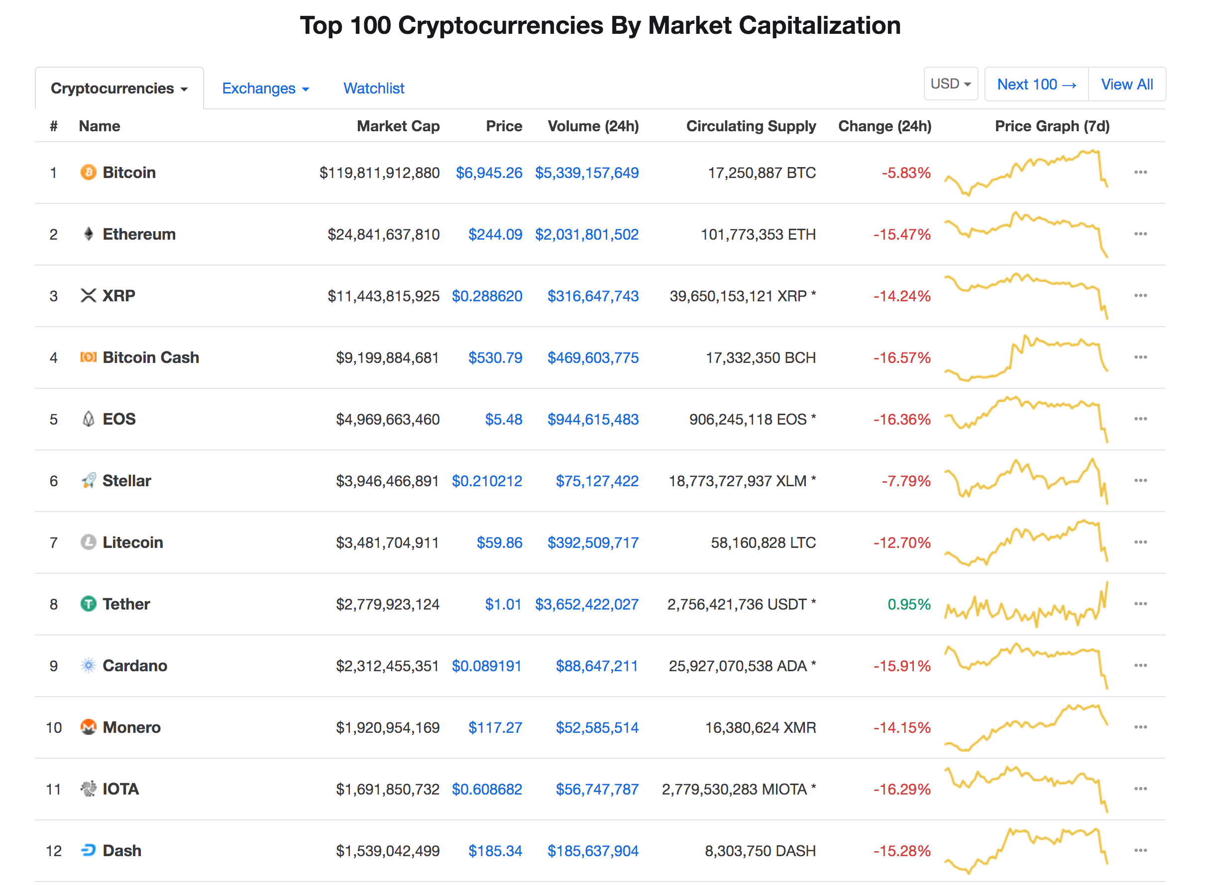 Bitcoin is down over five percent in the last 24 hours, but ‘altcoins’ have been hit harder. Ethereum (down 14 percent), XRP (down 13 percent), EOS (down 16 percent) and Litecoin (down 11 percent) are seeing bigger drops, according to data from Coinmarketcap.com.