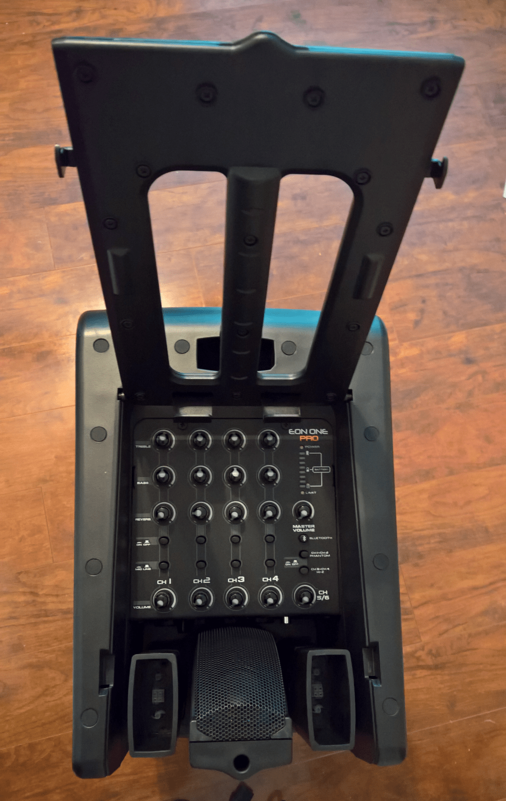 The Eon One Pro weighs 37.5 pounds, and it’s all very compact. The 8” subwoofer is right up front, and you fit the 118 dB speaker array directly on top. This, and the two optional spacers, fit nicely in the back of the unit. The overall design of the Eon Pro really is nice. The spacers essentially increase the range of the speaker, so their usefulness is really dependent on your environment.