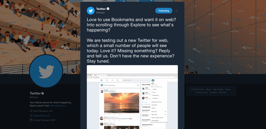 https://twitter.com/Twitter/status/1037742693575733248?ref_src=twsrc%5Etfw%7Ctwcamp%5Etweetembed%7Ctwterm%5E1037742693575733248%7Ctwgr%5E363937393b636f6e74726f6c&ref_url=https%3A%2F%2Fwww.businessinsider.com%2Ftwitter-tests-major-redesign-of-desktop-website-2018-9