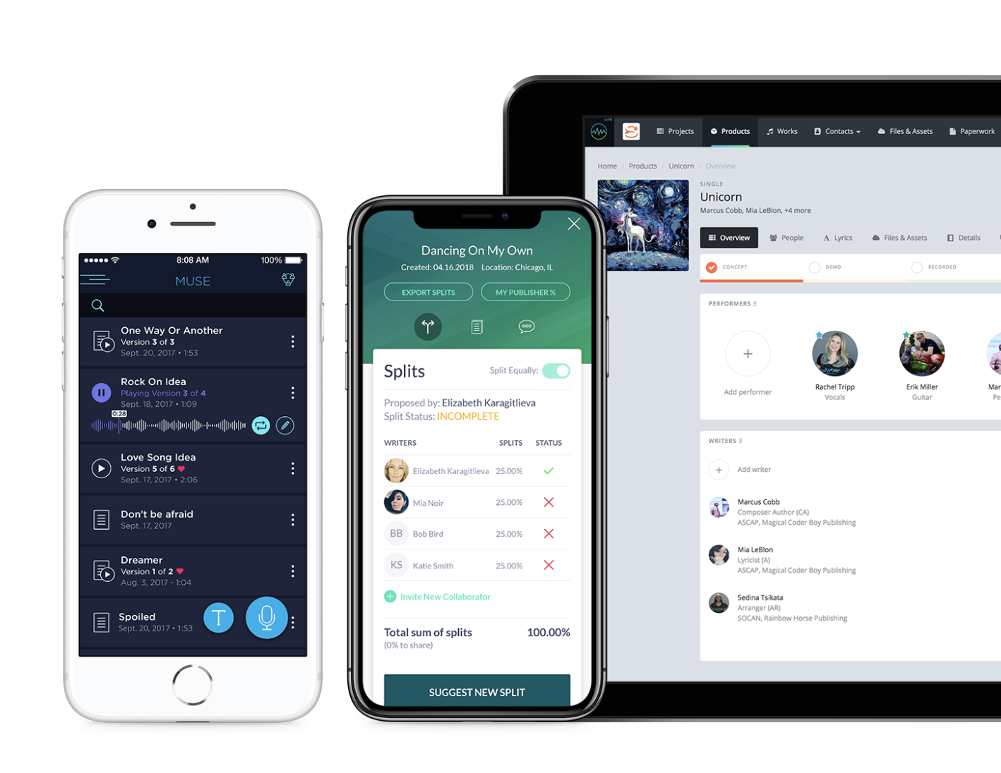 Jammber “Muse” gives collaborators a single platform to exchange lyrics and song ideas, while the company’s “Splits” app tracks ownership and credits of any eventual product from a collaboration. The company’s nStudio tracks songwriting credits to assist with chart and Grammy submission — through a partnership with Nielsen Music — and its “PinPoint” helps organize touring. The recording applications even have a presence feature so session musicians, songwriters and artists can actually be tagged in the studio while they’re working.