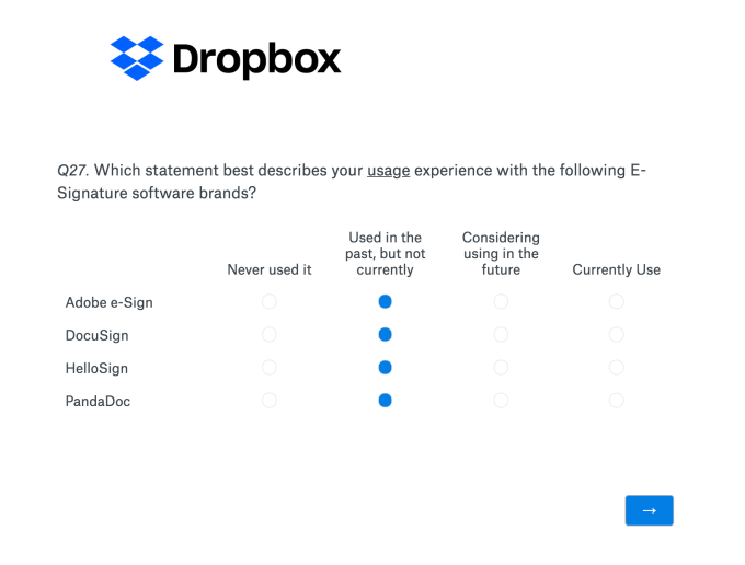 In addition to soliciting general feedback about the product, Dropbox also asked survey respondents about their usage of other e-signature brands, like Adobe e-Sign, DocuSign, HelloSign, and PandaDoc, as well as their usage other more traditional methods, like in-person signing and documents sent over mail.
