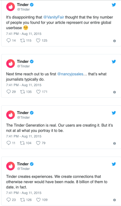 The VF piece wasn’t representative of Tinder’s larger user base, only a sliver. And the complaints from a few users couldn’t be used to make a point about the entire industry.