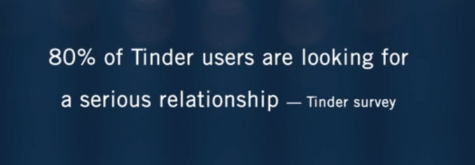 “80% of Tinder users are looking for a serious relationship,” says one Tinder survey. The text then fades, and the next statistic, this time from Hinge, appears.