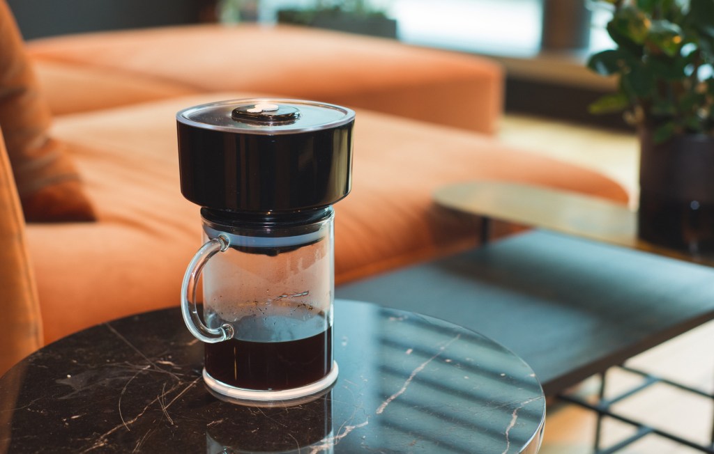 “They implement a similar principle in a very different way,” Umaña said. His device doesn’t require this dance of hot and cool; you put the cylindrical device, about the size of “a big burger,” on the included carafe and add the ground coffee. Pour in the hot water, put the lid on and wait a bit for the oils and such to extract. Then hit the button on top and let it do its thing.