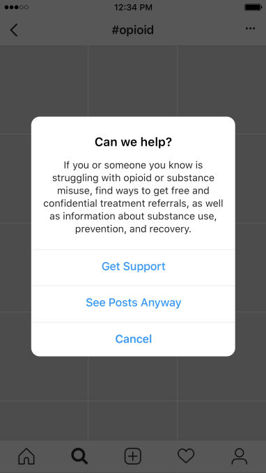 These pop-ups will appear when users search for opioids, prescription drugs or illegal drug hashtags, and the company will add more hashtags to the list over time. They’ll show up today in the U.S. before rolling out globally in the coming weeks. Info will also be available to assist concerned friends and family of victims. “We worked in close partnership with Substance Abuse and Mental Health Services Administration, the NCADD, and the Partnership for Drug Free Kids to offer these resources,” Instagram explained.
